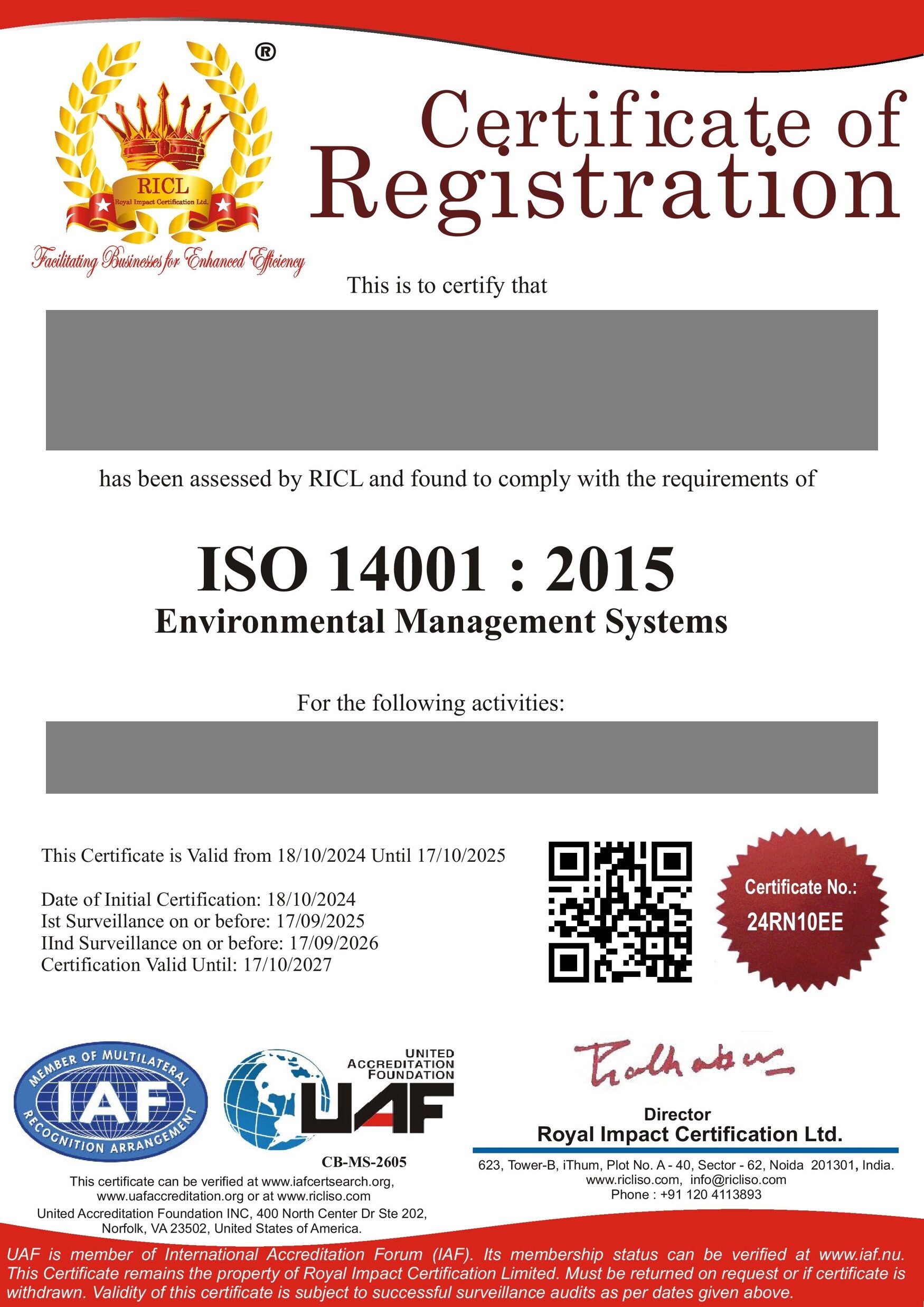 Contoh sertifikat pemenuhan persyaratan ISO 14001:2015 oleh lembaga sertifikasi RICL (Royal Impact Certification Limited) yang terakreditasi oleh UAF (United Accreditation Foundation) yang telah menjadi anggota dari IAF (International Accreditation Forum)