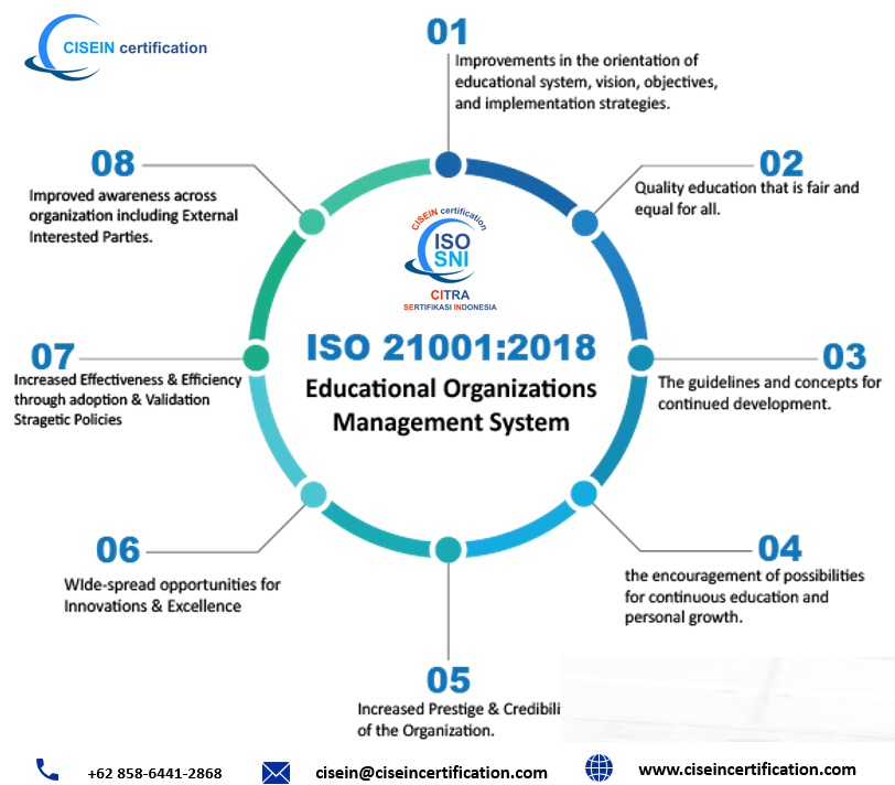 PT. CITRA SERTIFIKASI INDONESIA (CISEIN Certification) memberikan pelatihan dan sertifikasi standar ISO 21001:2018 untuk karyawan perusahaan atau organisasi. Kami dapat merekomendasikan konsultan yang berpengalaman untuk membantu tim ISO perusahaan membangun dan menerapkan standar ISO 21001:2018 sebelum auditor kami memastikan pemenuhan persyaratan standar ini. Namun tim ISO perusahaan dapat saja membangun dan menerapkan sistem manajemen ini tanpa bantuan konsultan.